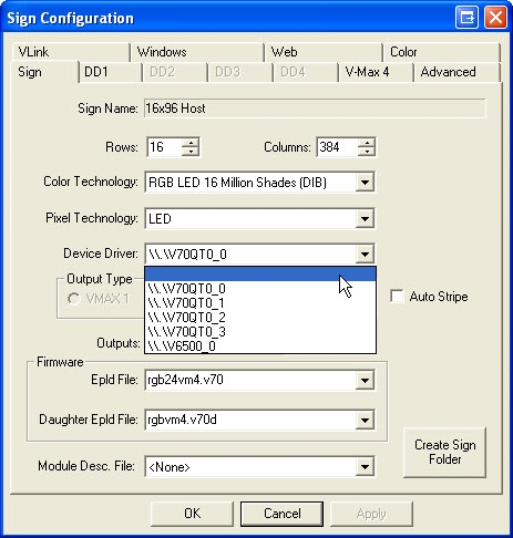 - Click Signs tab, double click the sign that needs the device driver, and in the Device Driver dropdown, select the new driver (usually _0 of the driver that was added)