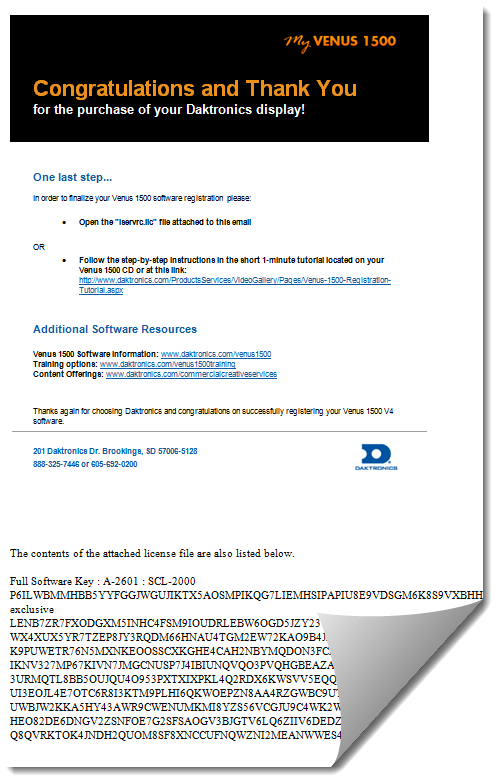 - This is a general email that gets sent to all users who use Venus 1500, Show Control or Vanguard software. The registration lservrc.lic file will still work for either of the 3 programs you requested registration for.