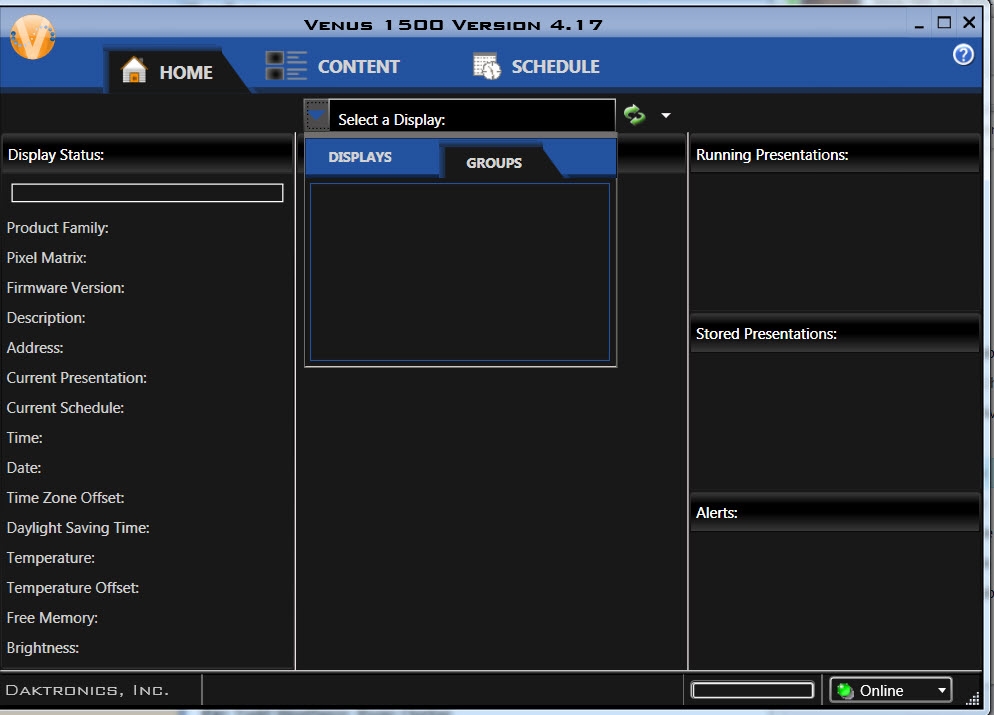 • Note:  If presentations are created under a group and then the group is later removed, each presentation created in the group will still appear in the Content tab under each individual display.