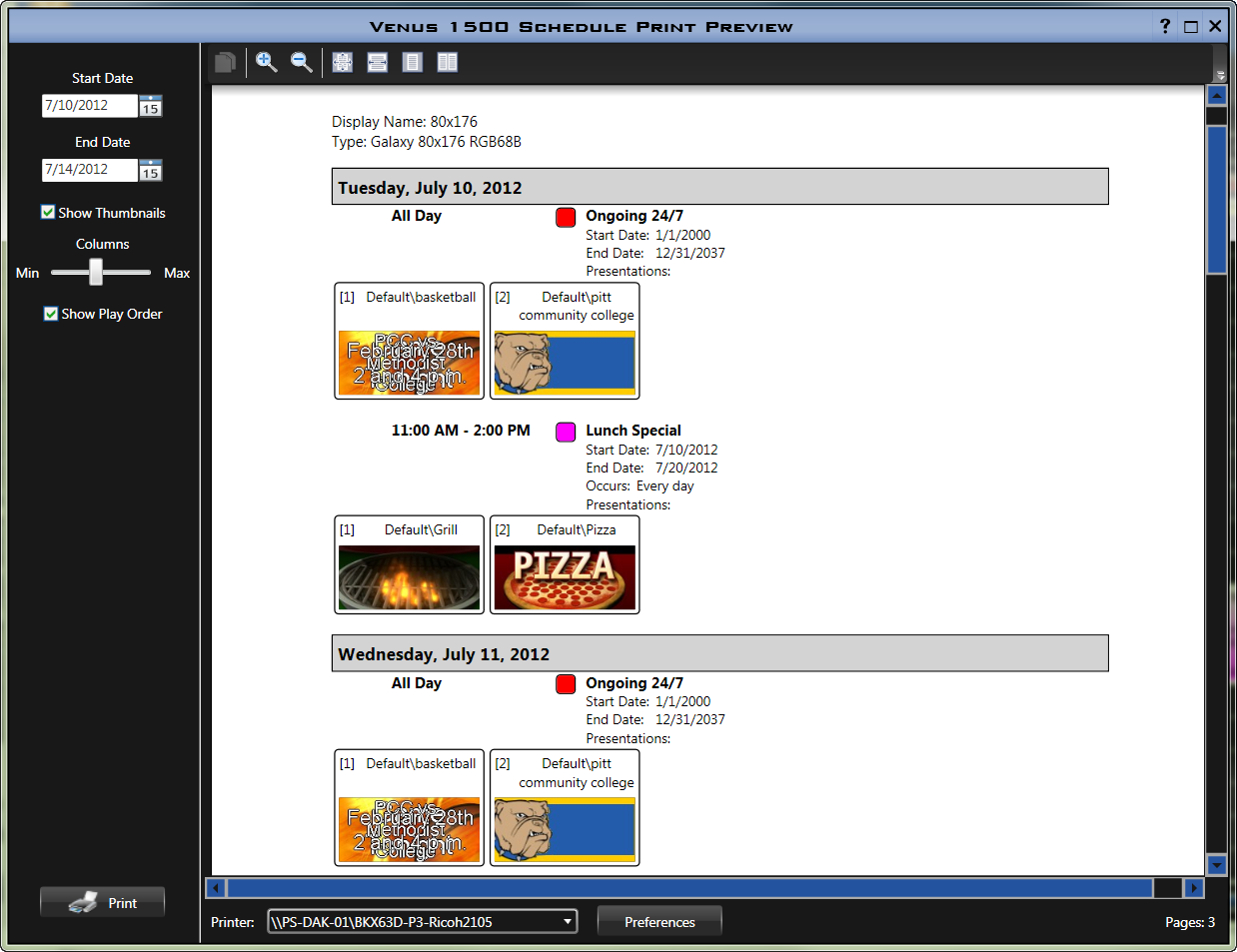 - The print preview window will allow you to choose the start and end date, show thumbnails option and show play order option.