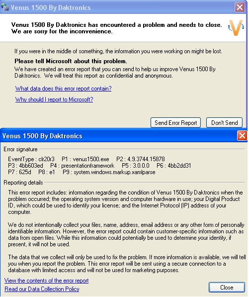 Venus 1500 v4 will crash upon opening and receive error "Venus 1500 by Daktronics has encountered a problem and need to close."