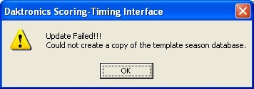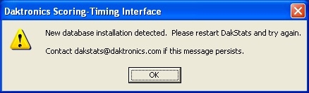 - When attempting to open the Daktronics Scoring-Timing Interface (DSTI) application or the NFL Interface application, database error messages such as the ones shown below appear: