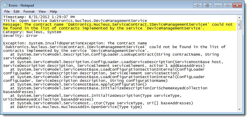 - Error: The contract name 'Daktronics.Nucleus.ServiceContract.IDeviceManagementService4' could not be found in the list of contracts implemented by the service 'DeviceManagementService'