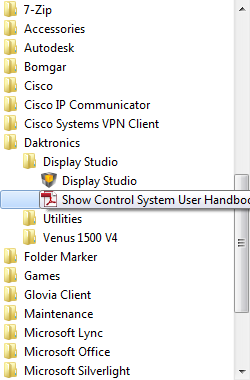 - Click on All Programs/Programs -> Daktronics file -> Display Studio -> Show Control System User Handbook.