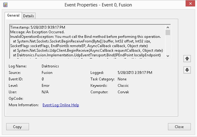 - When viewing the Event Viewer Logs for Fusion, you see the following error: