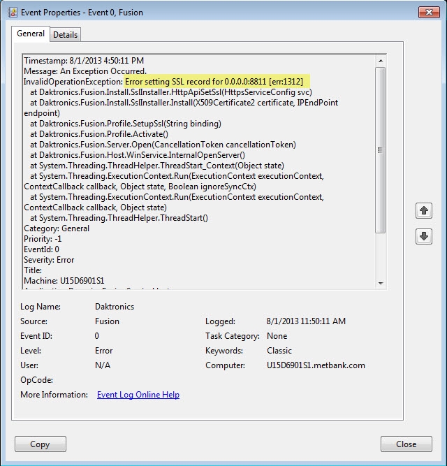 Receiving error in Fusion Event Logs "Error setting SSL record for 0.0.0.0:8811 [err:1312]"