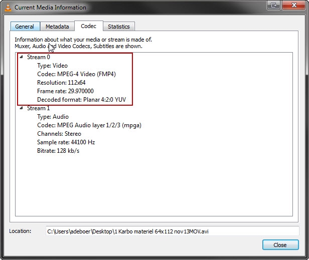 4. Look at the Stream 0 for video, Stream 1 for Audio