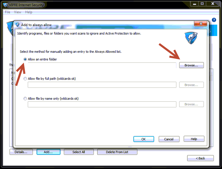 4. Select the Allow an entire folder radio button, then the Browse button to select the folders.