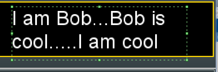 - When looking at scrolling text message, the scrolling text element box (green dashed border) is beyond the gold message frame border on at least one side of the window.