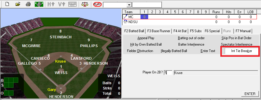 - You will be prompted by DakStats to enter in the number of the player that will start the inning on 2nd base. After typing in the number, confirm the correct player has been added to 2nd base and then select enter.