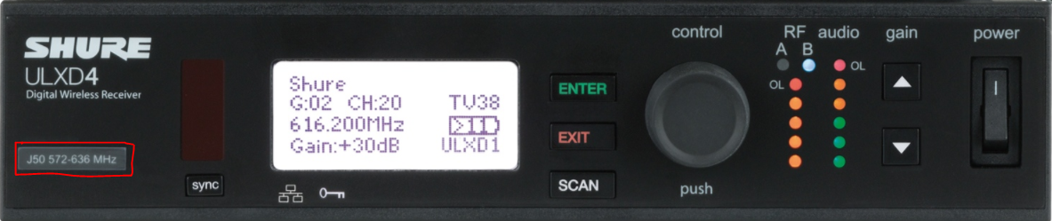 - For Shure ULX-D receivers, the frequency band can be found at the left of the receiver