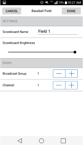 - If the scoreboard is radio controlled, cycle power to the scoreboard to view the radio settings (default: b1C1). Tap the app menu, and select Settings. Verify the radio settings displayed on the scoreboard match the Broadcast Group and Channel numbers in the app