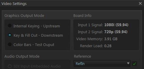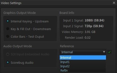 The Video Settings dialog appears. - In the Graphics Output Mode area select Key and Fill Out - Downstream to route the score bug and the video out for downstream keying at the switcher.