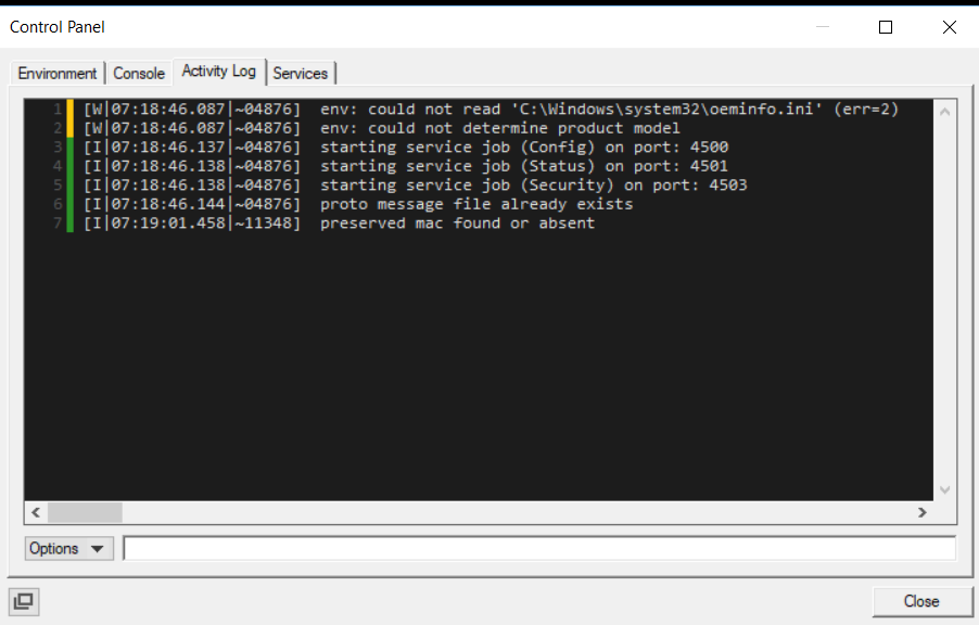 - You can also adjust how much information is being logged using the Options button at the bottom left of the Control Panel window.