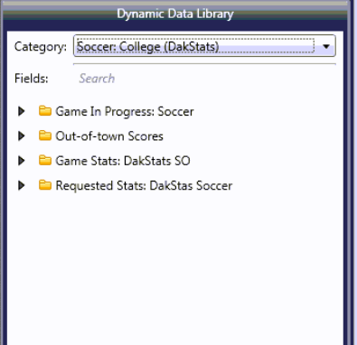 - The Game Stats - DakStats SO folder contains the real time data fields that are being sent from DakStats Soccer. This information contains both game and team level information. This information includes both Home and Guest team information, score, shots, SOG, SOG%, assists, corner kicks, pk attempts, pk makes, pk misses, fouls, offsides, yellow cards, red cards, blocks, saves, goals against, goals against average, last 3 goal scorer's and assister's information as well as last 3 players to get a card.