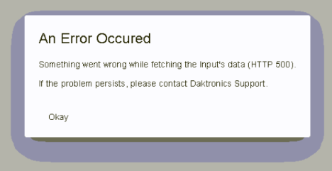 - Receiving error of "An Error Occurred, Something went wrong while fetching the input's data (HTTP 500). If the problem persists, please contact Daktronics Support".
