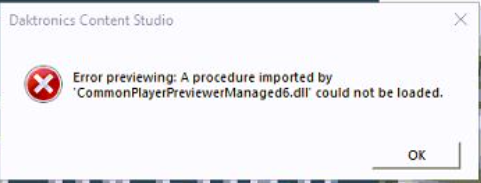 - Receive the following error, "Error previewing: A procedure imported by 'CommonPlayerPreviewManaged6.dll' could not be loaded" when trying to play preview in Content Studio.