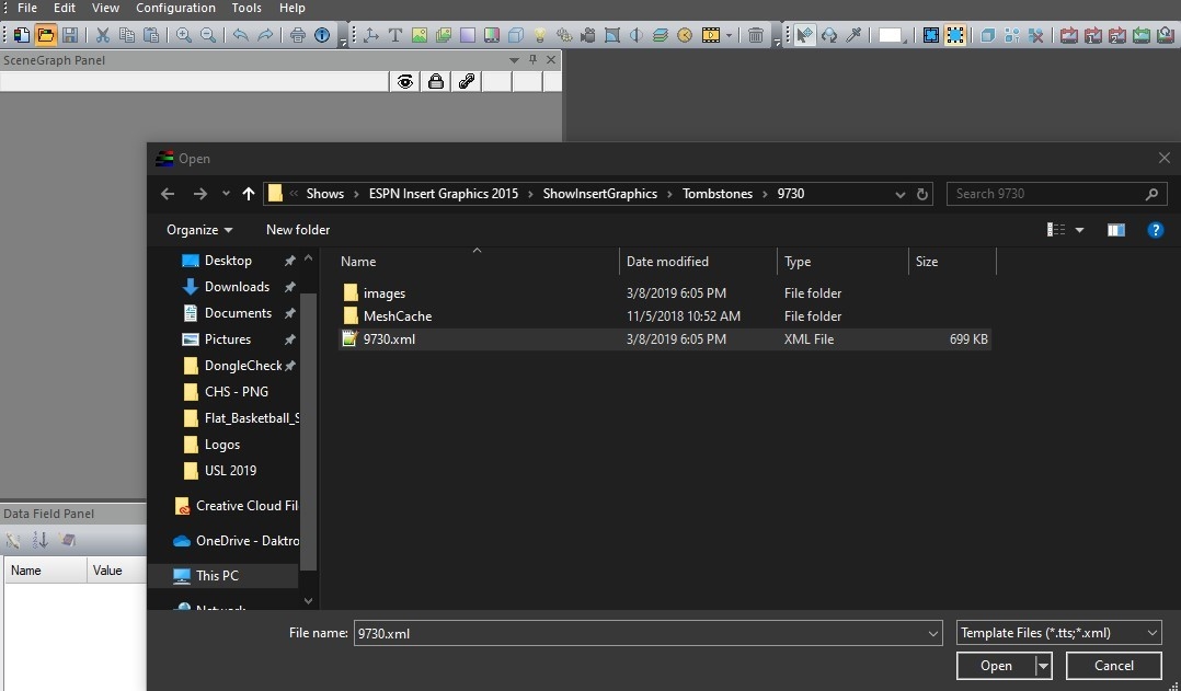 - Launch Camino and load a file from the baseball insert graphic folder. The folder is located at C:\ProgramData\AJT Systems\MAM\Baseball\Shows\ESPN Insert Graphics 2015\ShowInsertGraphics\Tombstones\9730