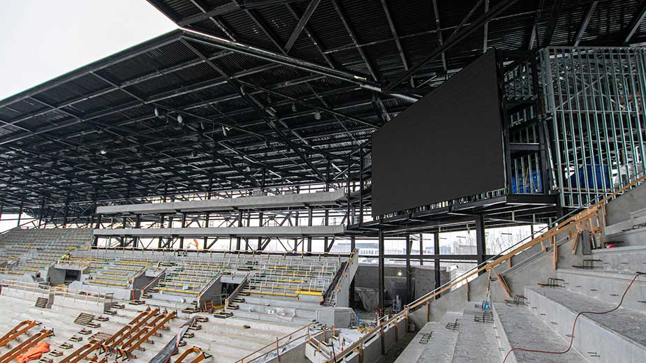 BROOKINGS, S.D. – Mar. 24, 2021 – To help Columbus Crew SC open a new downtown stadium in Columbus, Ohio, the club has partnered with Daktronics (NASDAQ-DAKT) of Brookings, South Dakota, to design, manufacture and install six LED displays to entertain and inform soccer fans at every match. Installation of the 8,700 total square feet of LED displays is ready for the opening of the stadium this July as the Club opens its modern and dynamic home.