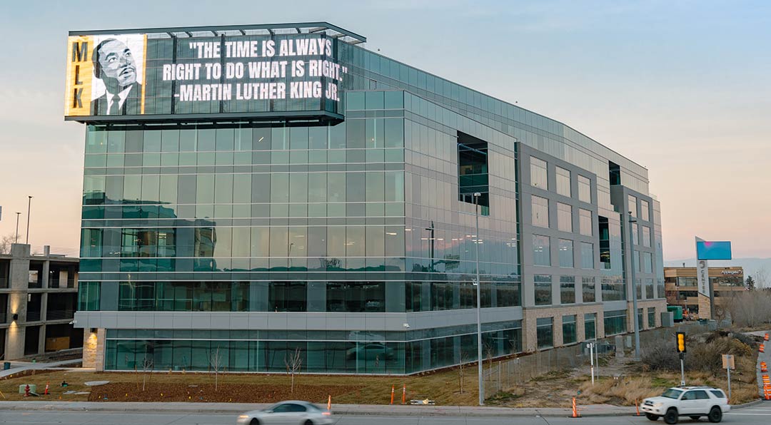 The first and largest freeform LED display in Salt Lake County along the I-15 corridor and second largest freeform display in the state measures 21 feet tall by 86 feet wide and features 25-millimeter pixel spacing to deliver visual imagery to passersby. It incorporates 131 horizontal rows and 1,040 vertical columns which allow light to pass through the display and into the windows behind the installation while projecting imagery outward.